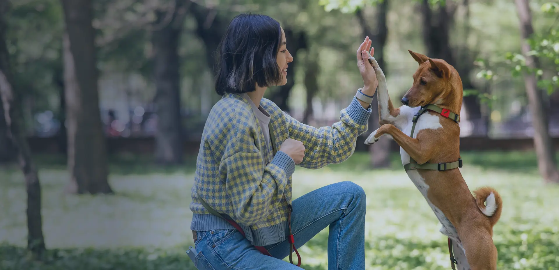 Étudiante tenant un chien souriant dans un parc pour illustrer la licence professionnelle Animal University en médiation, éducation et comportement